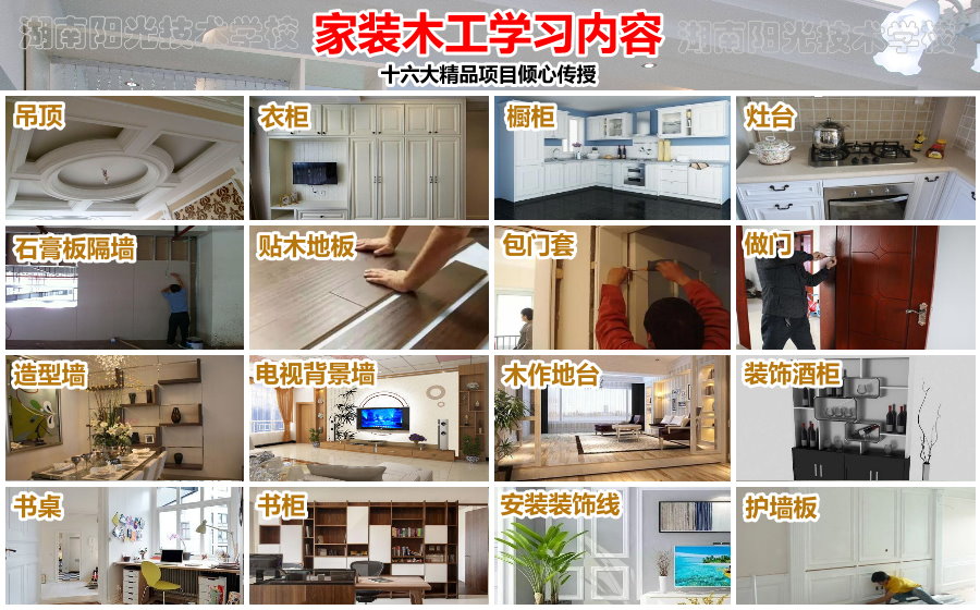9,重点学习:吊顶、衣柜、橱柜、灶台、石膏板隔墙、贴木地板、包门头、包门套(包括做门)、窗帘盒制作安装、造型墙、电视装饰背景制作、木作地台、装饰酒柜、书桌、书柜、安装木质装饰线、护墙板等十六种家装木工技术。